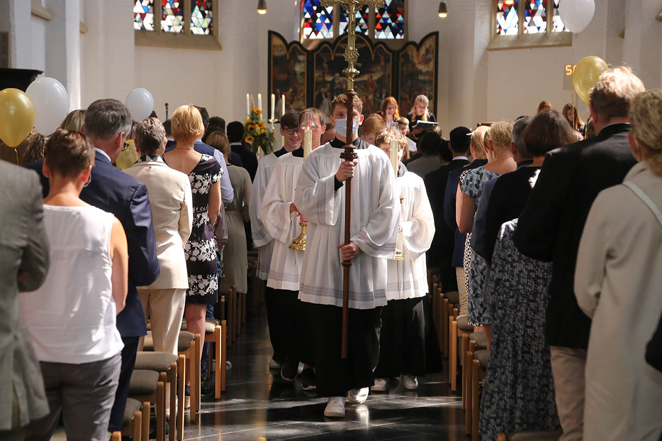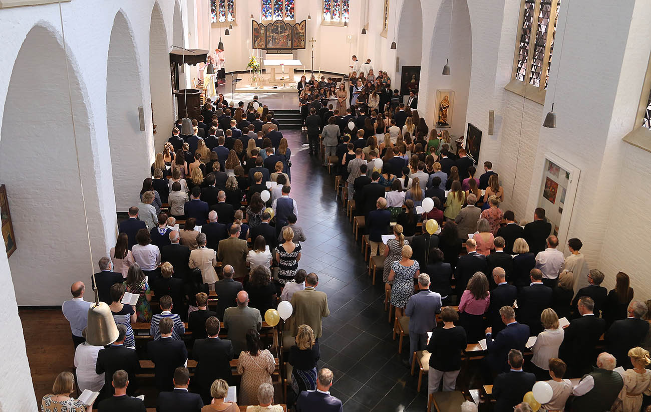 Es ist sicherlich der Wunsch einer jeden Gaesdoncker Schülerin, eines jeden Gaesdoncker Schülers, irgendwann auf die Gaesdoncker Aulabühne zu treten und aus der Hand der Schulleiterin das Reifezeugnis entgegenzunehmen. Heute war es für unsere Abiturientia 2022 so weit. Zunächst hatte man in der Klosterkirche gemeinsam mit Weihbischof Lohmann einen Dankgottesdienst gefeiert, um nach einem gemeinsamen Abifoto und dem Vergraben einer Zeitkapsel mit Wünschen für die Zukunft dann in der Aula das Abiturzeugnis überreicht zu bekommen.