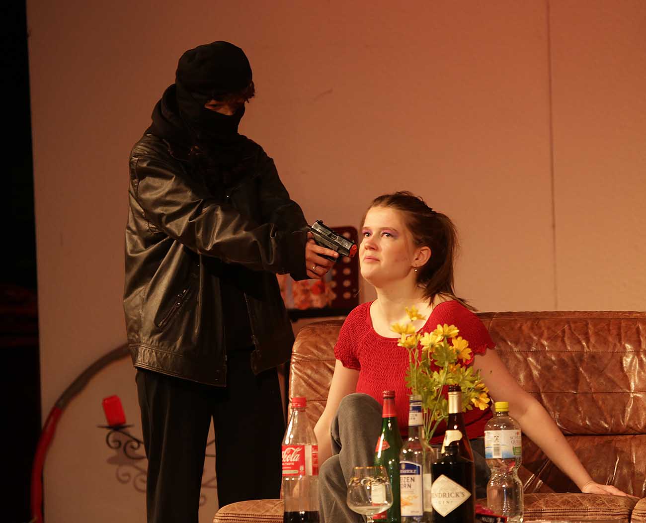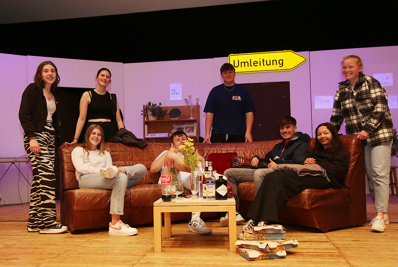 Heute wurde nach langer Coronapause wieder ein Theaterstück auf der Gaesdonck aufgeführt. Die Schulgemeinschaft wurde Zeuge der Premiere der Komödie „Doof gelaufen“, die vom Literaturkurs der Jahrgangsstufe Q1 unter der Leitung von Lars Poley inszeniert worden ist:
