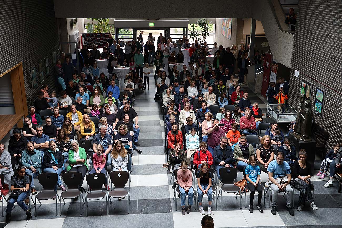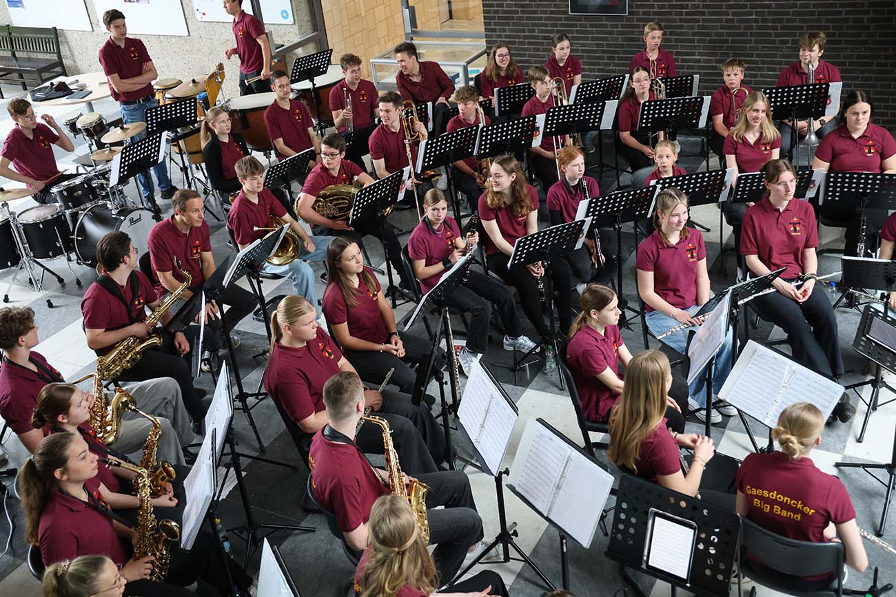 Nach der Begrüßung durch Dr. Oberdörster, Herrn Gysbers und Frau Schleede-Schmalz gab Erprobungsstufenkoordinatorin Frau Kleine-Grefe den Neu-Gaesdonckern dann schon mal ein paar gute Tipps mit in die anstehenden Sommerferien. Danach präsentierte die Bigband unter der Leitung von Philipp Niersmans einige Stücke im Foyer des Schulgebäudes.