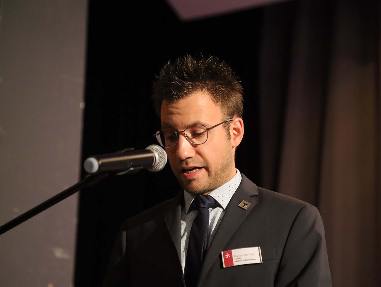 Nach der Begrüßung und vor der Kurseinteilung war es an der Zeit, sich herzlich von der nun ehemaligen Physik-Dozentin, Ines Knospe, zu verabschieden und ihr für die geleistete Arbeit und für das von ihr eingebrachte Engagement herzlich zu danken. Wie Koordinator van Briel in seinen Dankesworten sagte: „Auch wenn der Nachfolger über zwei Meter groß ist, so sind die Fußspuren, die Frau Knospe hier beim Kinder College hinterlässt, bildlich gesprochen riesig!“