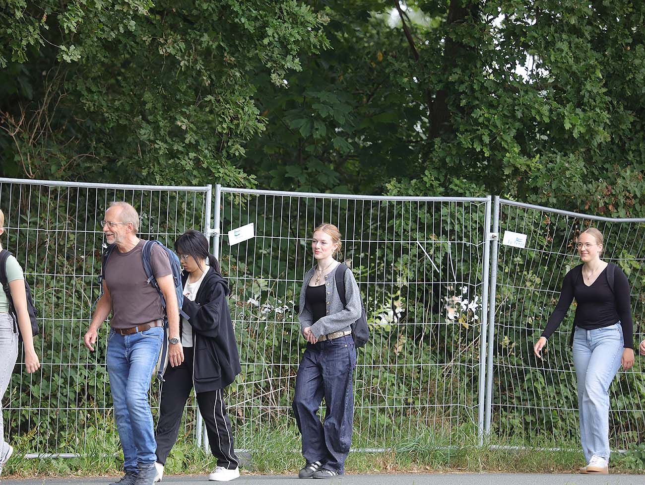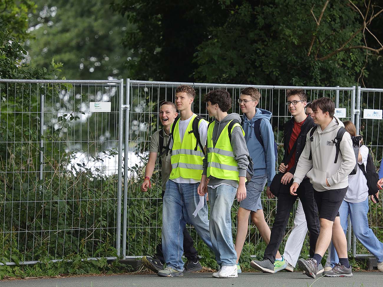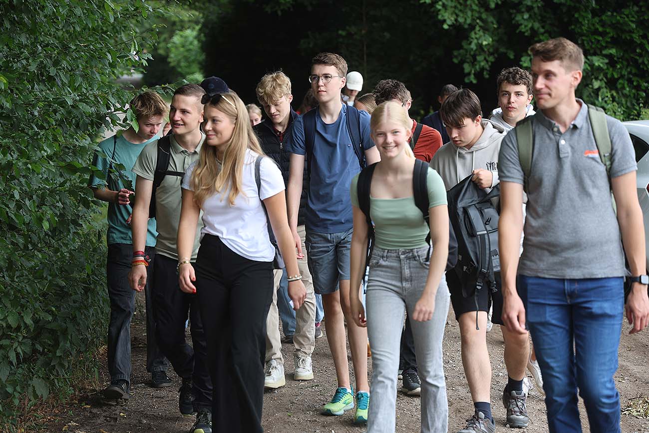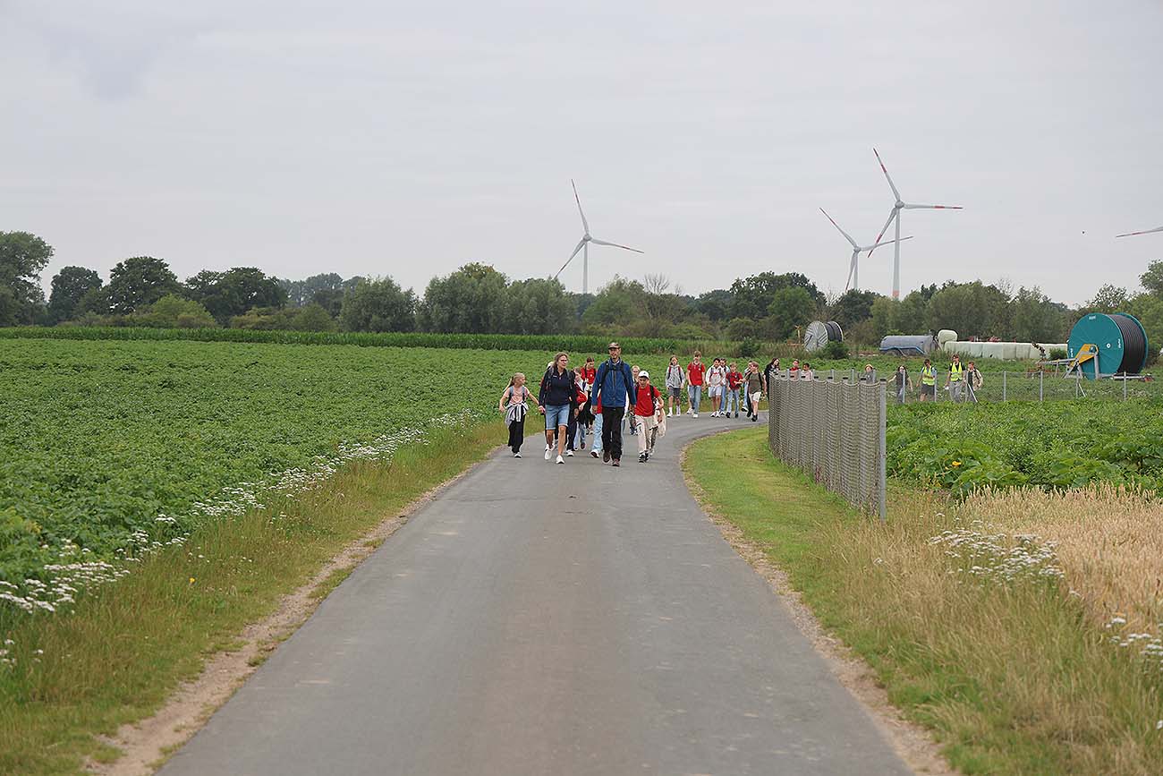Schon früh am Morgen starten die Gruppen auf dem Campus der Gaesdonck, nachdem siein der Klosterkirche einen ersten Impuls zum Thema „Glaube – Hoffnung – Liebe“ bekommen hatten. Zwei Routen stehen zur Wahl: Eine führt etwas kürzer und direkter für die jüngeren Teilnehmenden Richtung Kevelaer. Die längere Strecke verläuft entlang des bekannten Parookaville-Geländes, vorbei am weitläufigen Campingareal. Unterwegs gibt es zwei Versorgungsstationen, an denen Wasser, Obst und kleine Snacks verteilt werden – eine willkommene Pause für alle Pilgernden.