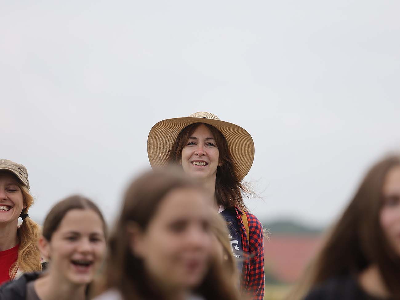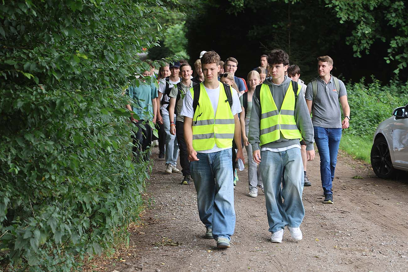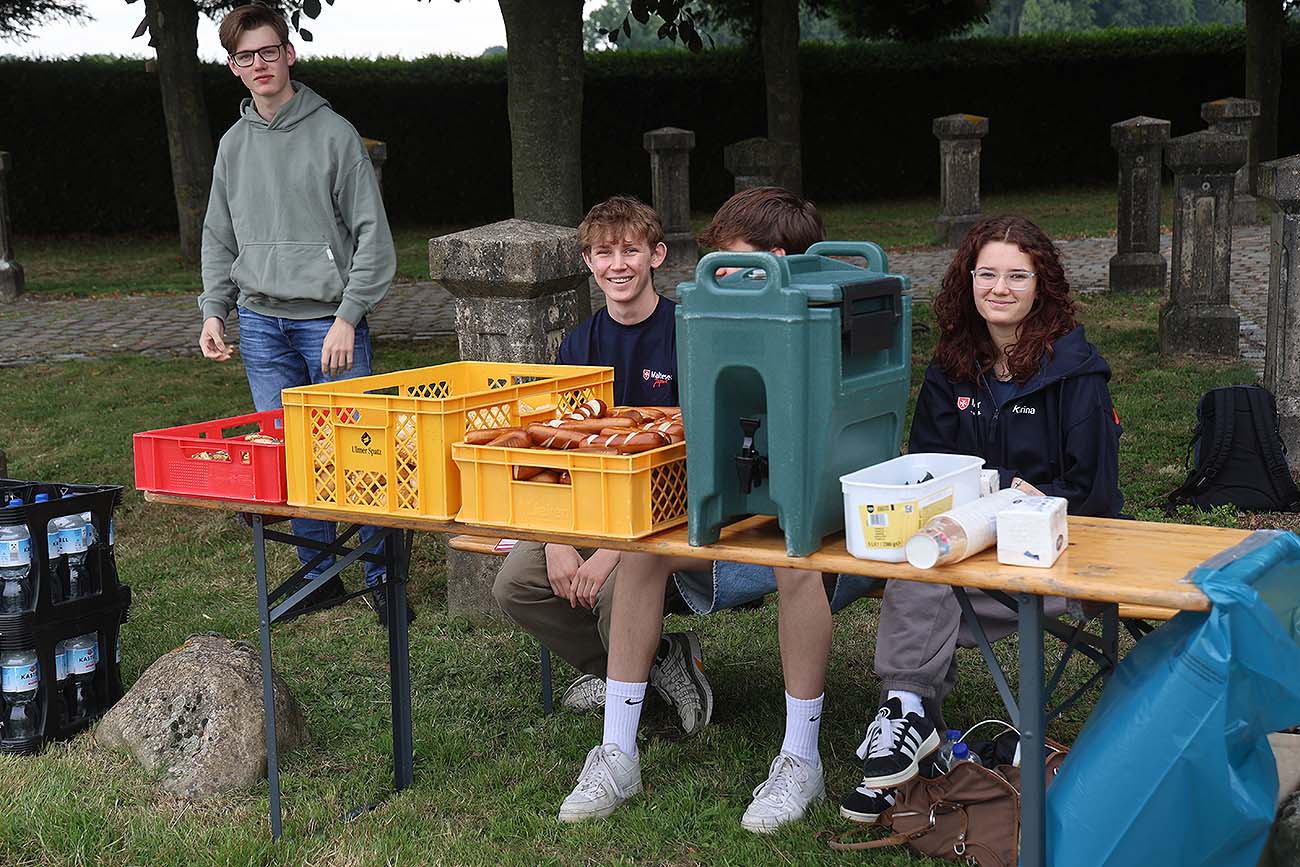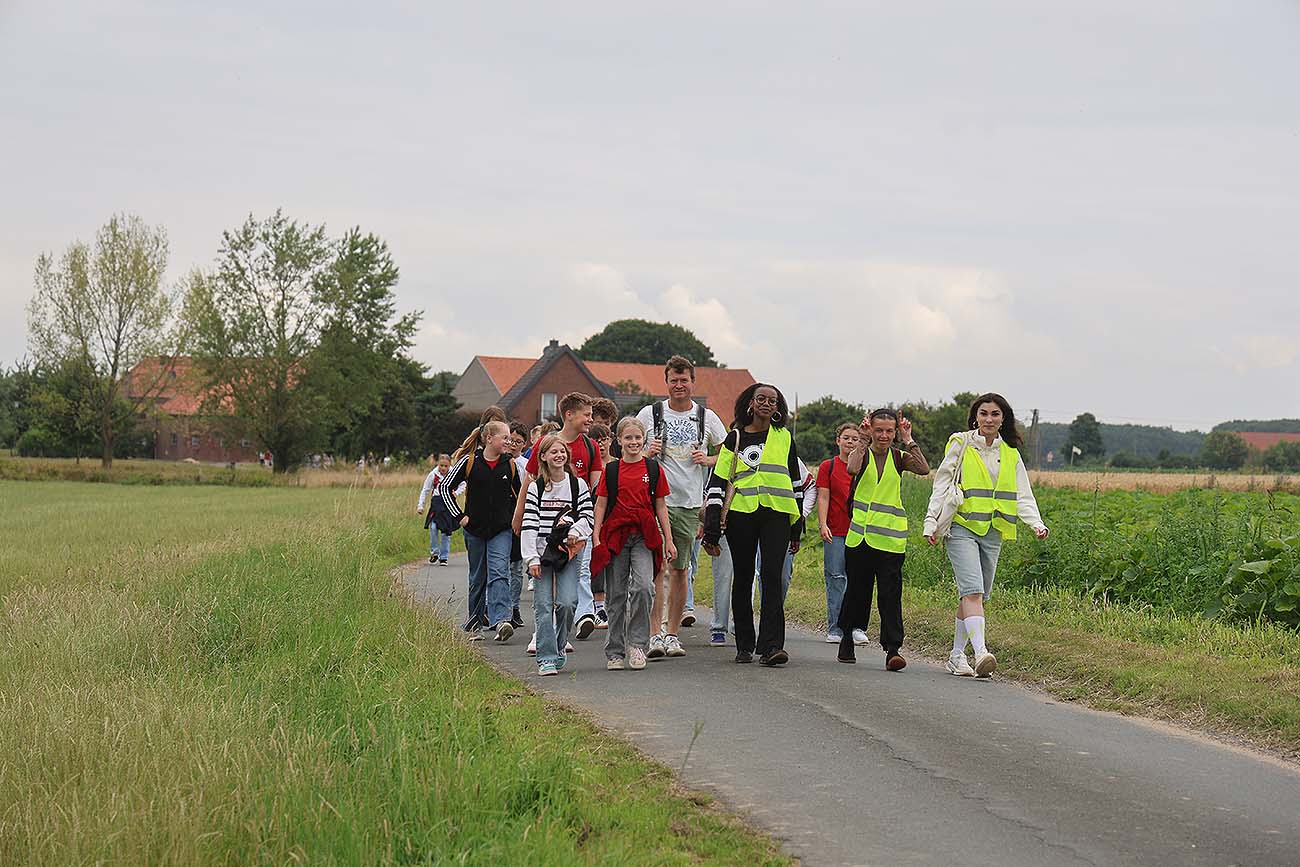 Schon früh am Morgen starten die Gruppen auf dem Campus der Gaesdonck, nachdem siein der Klosterkirche einen ersten Impuls zum Thema „Glaube – Hoffnung – Liebe“ bekommen hatten. Zwei Routen stehen zur Wahl: Eine führt etwas kürzer und direkter für die jüngeren Teilnehmenden Richtung Kevelaer. Die längere Strecke verläuft entlang des bekannten Parookaville-Geländes, vorbei am weitläufigen Campingareal. Unterwegs gibt es zwei Versorgungsstationen, an denen Wasser, Obst und kleine Snacks verteilt werden – eine willkommene Pause für alle Pilgernden.