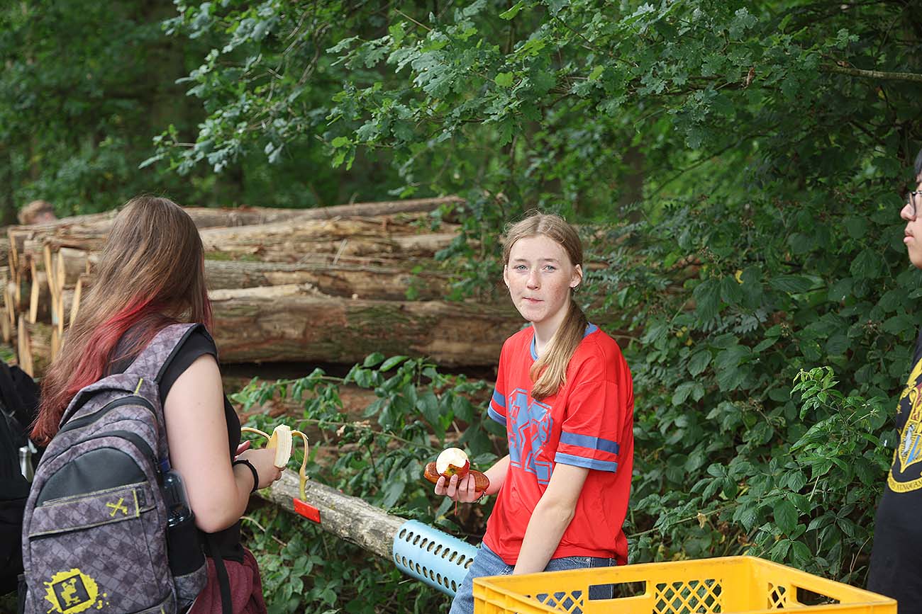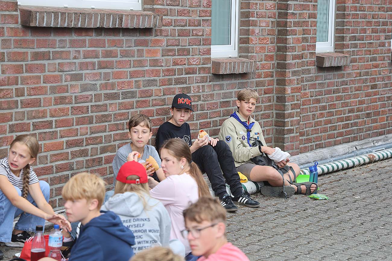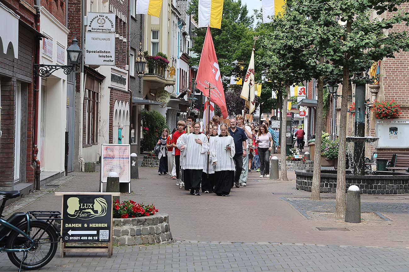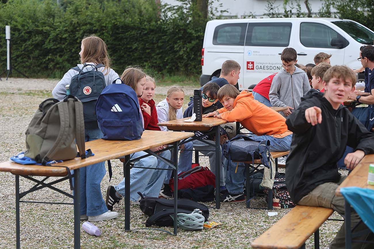 Schon früh am Morgen starten die Gruppen auf dem Campus der Gaesdonck, nachdem siein der Klosterkirche einen ersten Impuls zum Thema „Glaube – Hoffnung – Liebe“ bekommen hatten. Zwei Routen stehen zur Wahl: Eine führt etwas kürzer und direkter für die jüngeren Teilnehmenden Richtung Kevelaer. Die längere Strecke verläuft entlang des bekannten Parookaville-Geländes, vorbei am weitläufigen Campingareal. Unterwegs gibt es zwei Versorgungsstationen, an denen Wasser, Obst und kleine Snacks verteilt werden – eine willkommene Pause für alle Pilgernden.