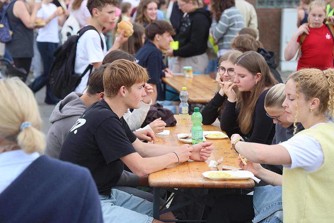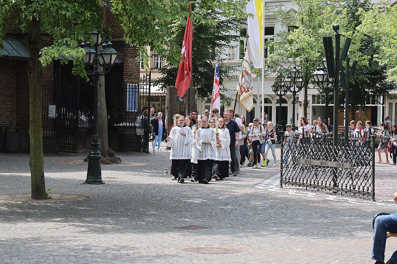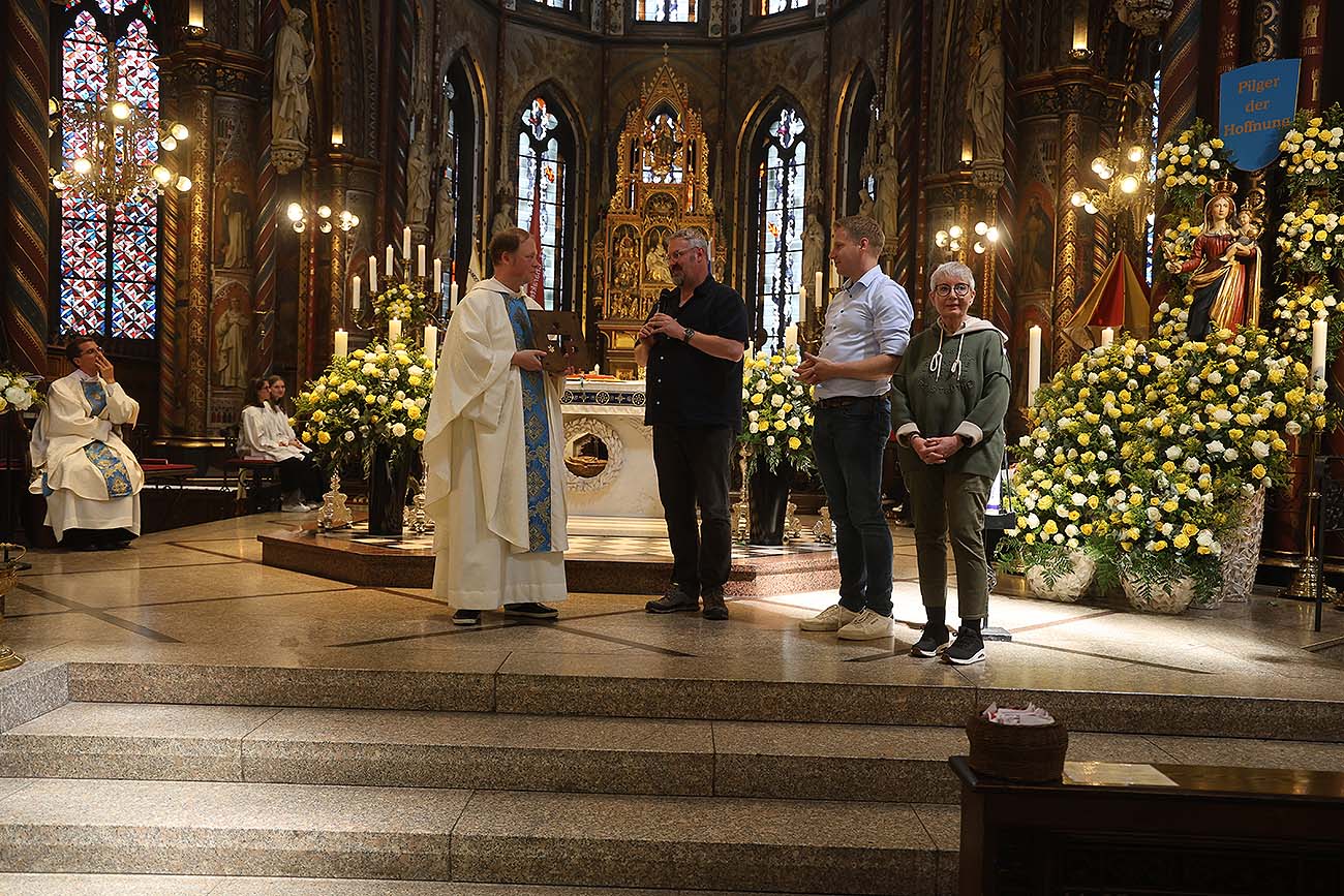 In Keylaer, einem kleinen Ort vor Kevelaer, treffen sich schließlich alle Gruppen. Von dort geht es in einem gemeinsamen Zug in die Stadt hinein – bis zur Basilika. Der abschließende Gottesdienst bildet den Höhepunkt den Abschluss, in dem sich die Eindrücke der gemeinsamen Wanderung, die Gespräche unterwegs und die kleinen stillen Momente bündeln. Am Ende des Gottesdienstes ließ sich das Direktorium nicht nehmen dem Spritual für seinen fünfjährigen unermüdlichen Einsatz für die Schüler auf der Gaesdonck zu danken, bevor er seine neue Stelle in Vechta antritt. Die Schulgemeinschaft bedankte sich bei Chrisoph Schwerhoff mit tosendem Applaus.