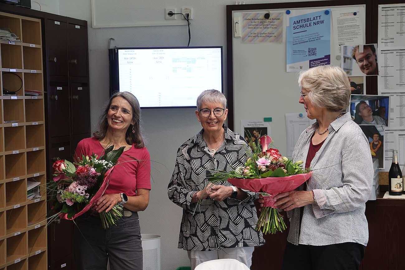 Im Anschluss wurden unsere Kollegen Rudi Bergers und Gerd Schalük mit einer Rede von Wolfgang Winter. der deren Wirken der letzten 30 Jahre zusammenfasste, verabschiedet. Nach über 30 Jahren an der Gaesdonck gehen beide in den Ruhestand. (Herr Bergers wird noch bei der IT und der digitalen Öffenlichkeitsarbeit unterstützen.) Zuvor in der Pause hatte Frau Schleede-Schmalz Frau Kaster und Frau Heyder verabschiedet, die uns in einer schwierigen Situation während des Schuljahres geholfen hatten.