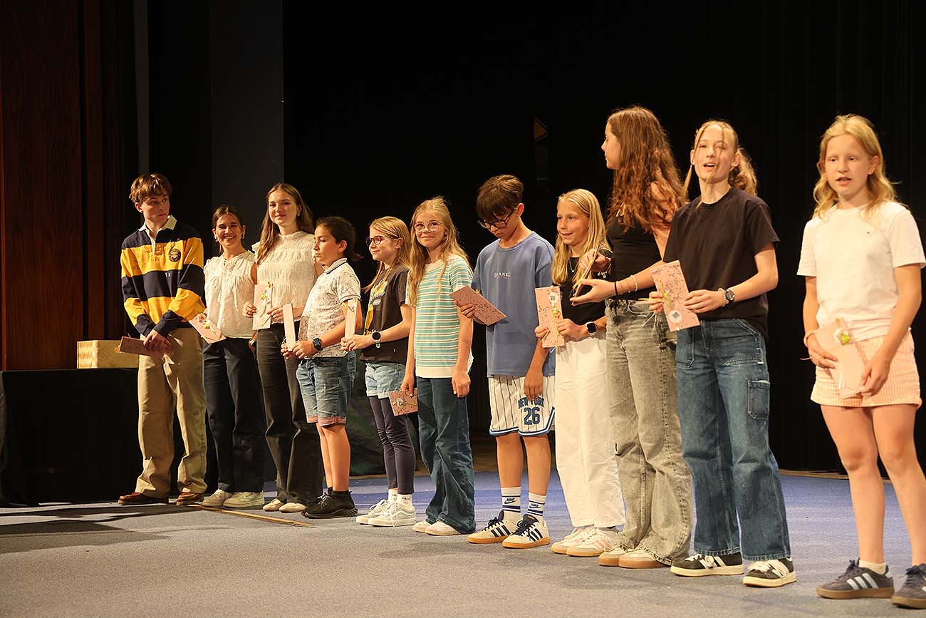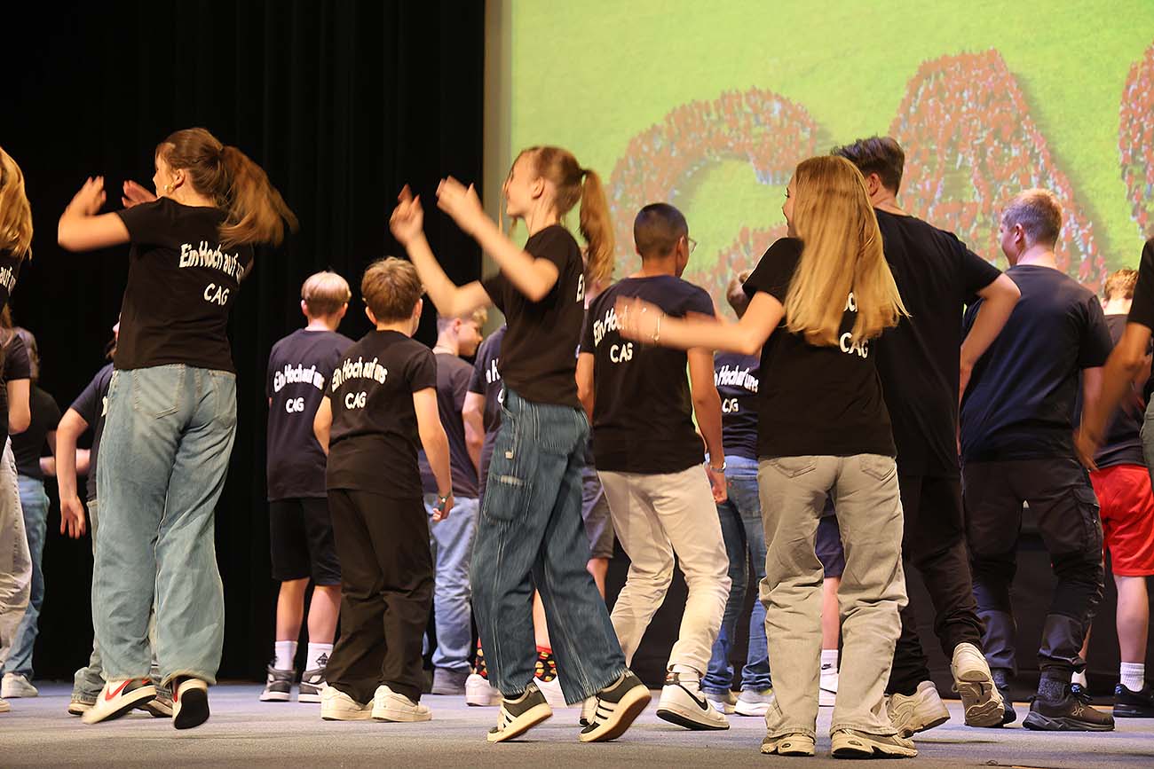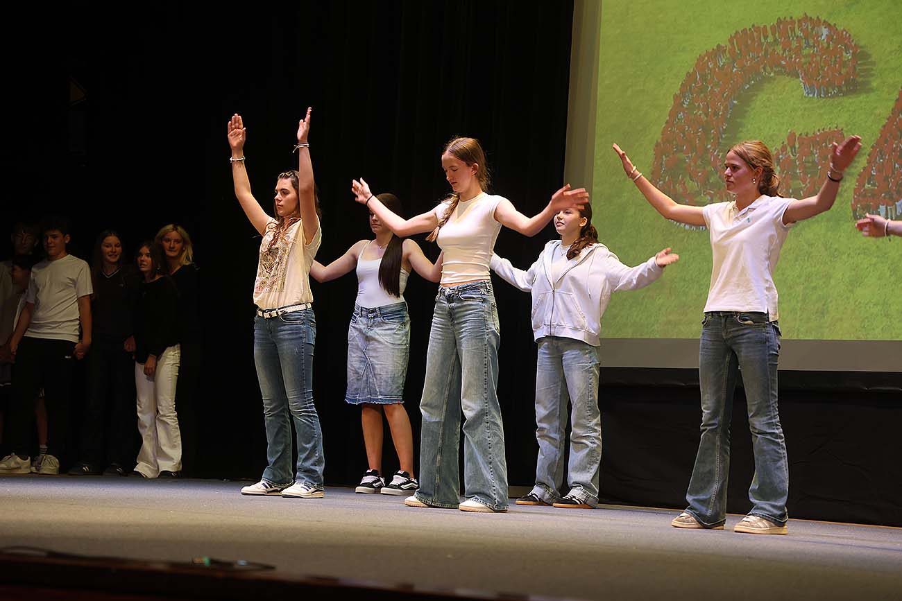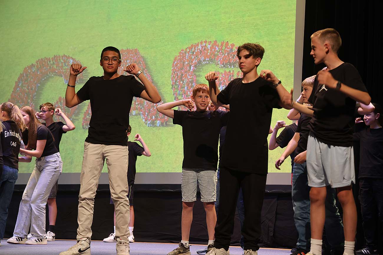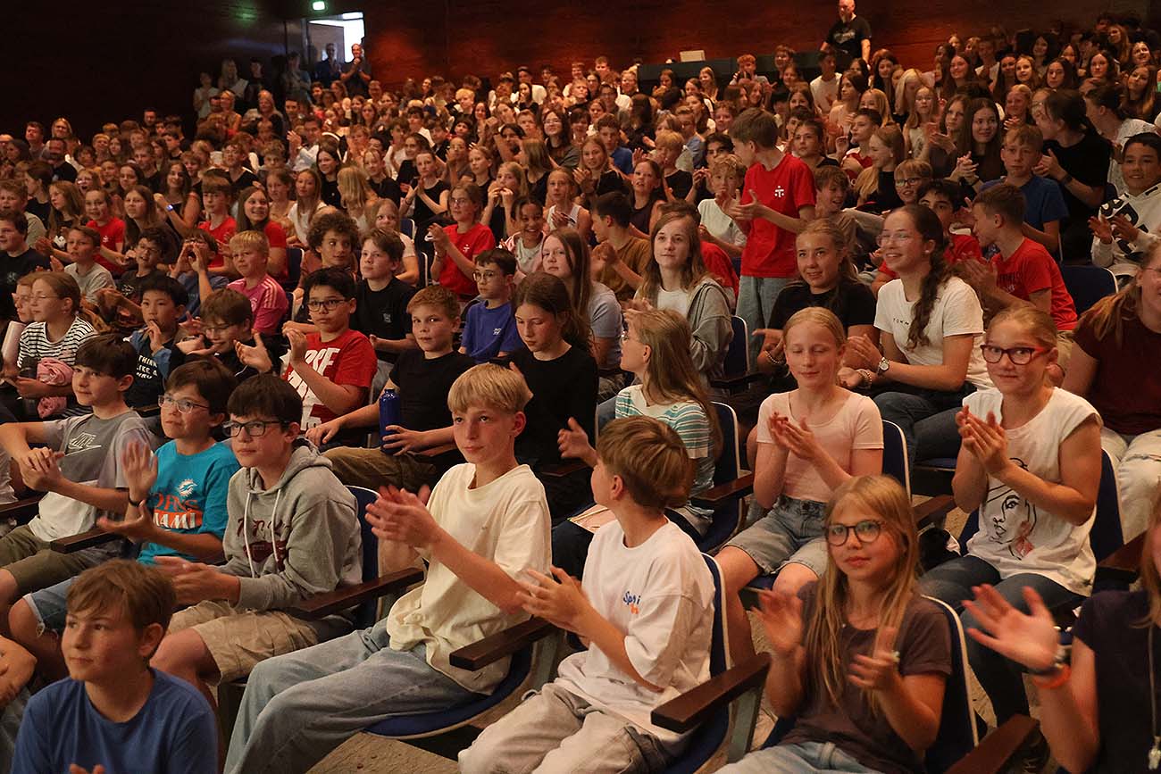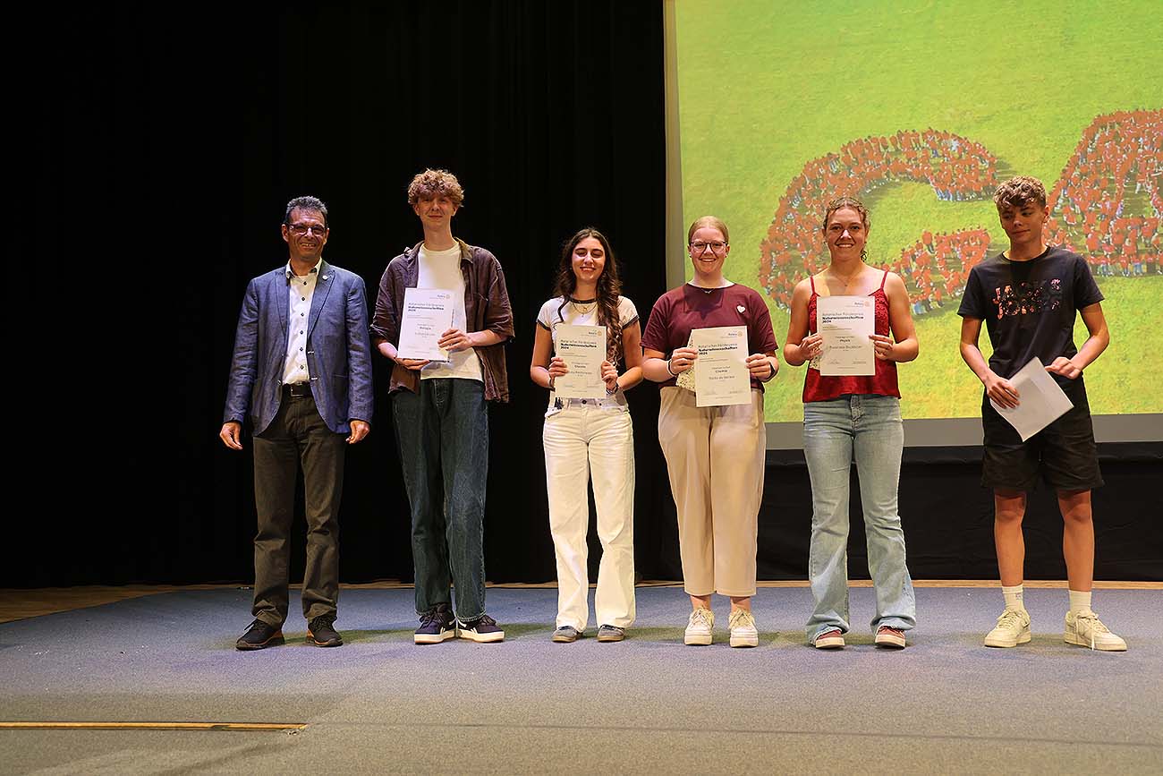 In der fünften Stunde folgten dann die Siegerehrungen und Preisverleihungen für besondere Leistungen im Schuljahr. Der Rotary Club spendet seit Jahren Preise für besonders talentierte Schülerinnen und Schüler in den Naturwissenschaften und die Sparkasse Rhein-Maas überbrachte einen Preis für die ausserordentliche Leistung unserer Triathlonmannschaft, der in den Pausen im Juvenat zu Einsatz kommen wird. Sehr schön anzusehen waren die Beiträge der Klassen, die entweder eingespielt oder live performt wurden.