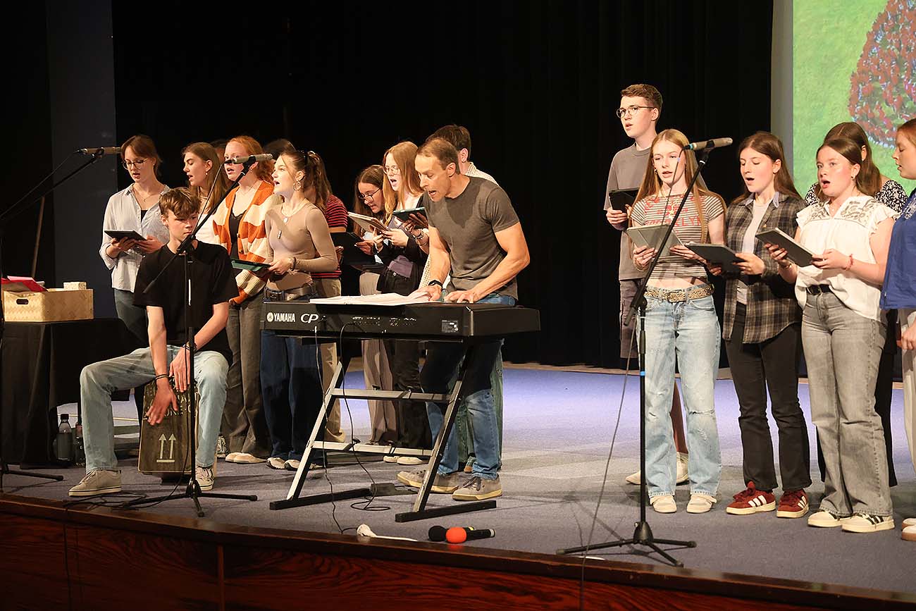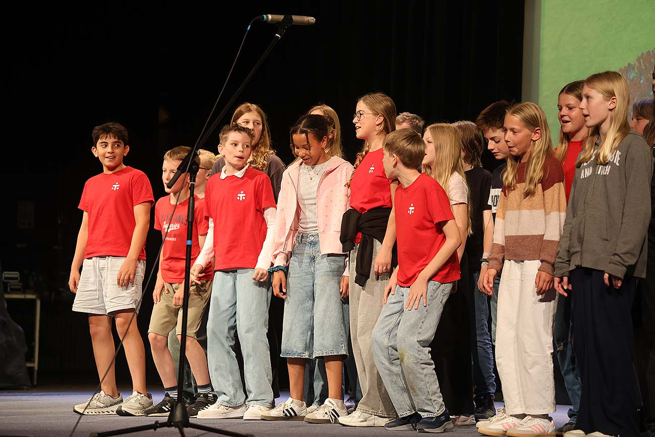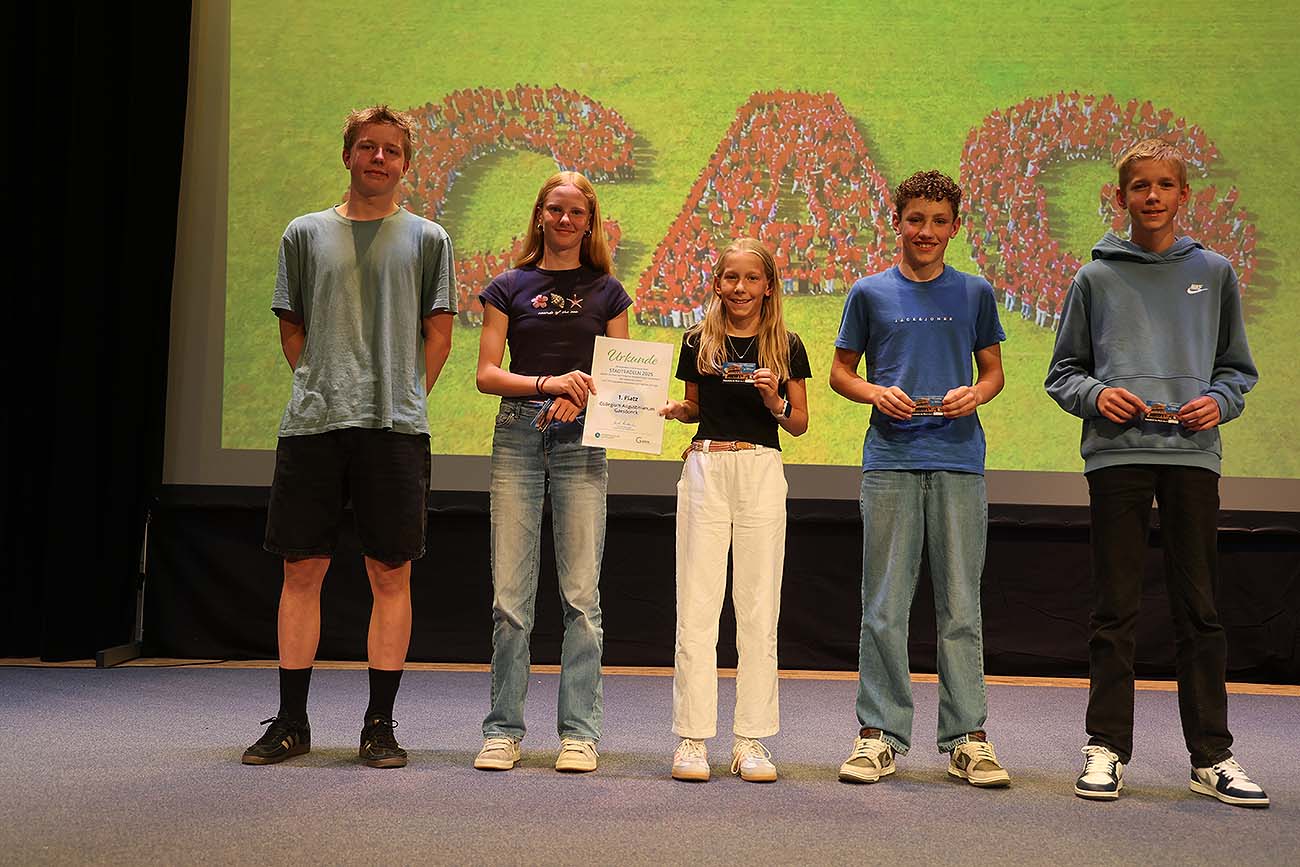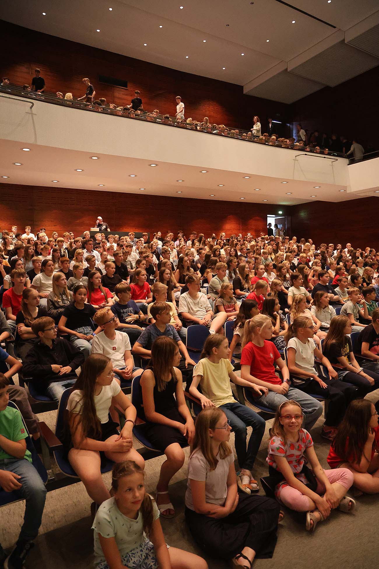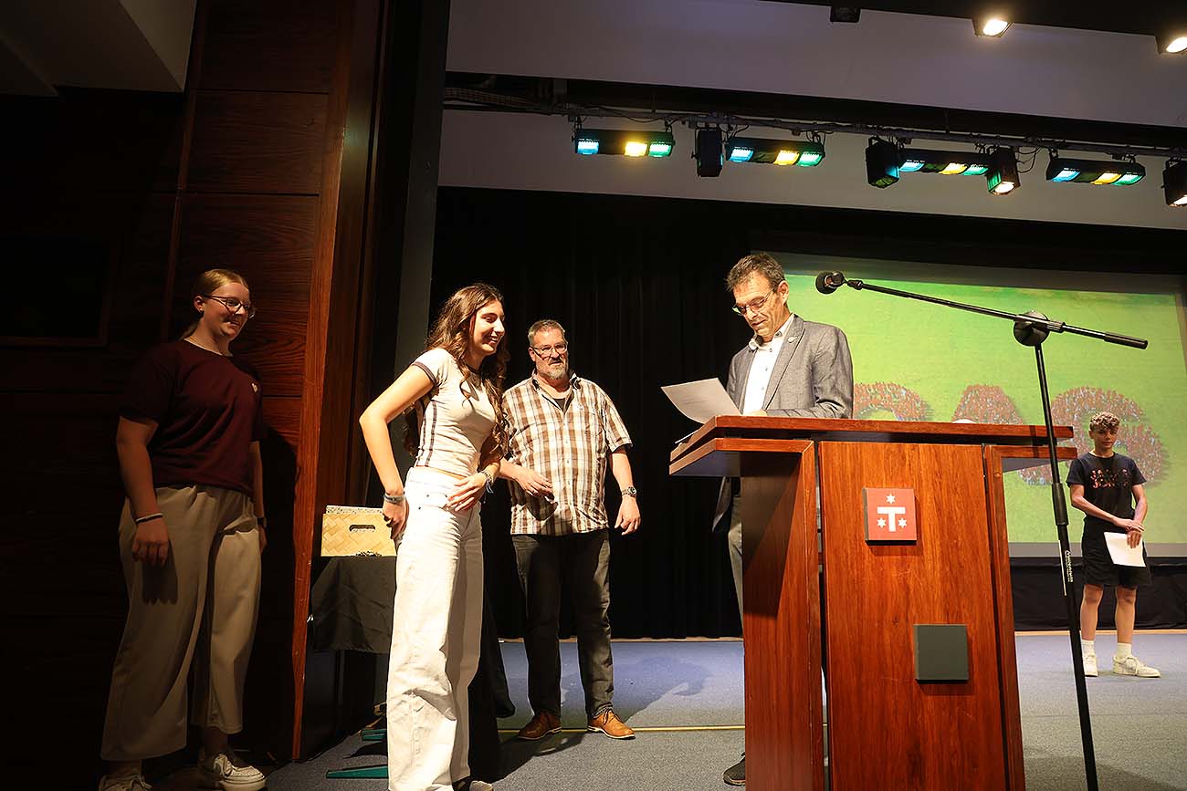 In der fünften Stunde folgten dann die Siegerehrungen und Preisverleihungen für besondere Leistungen im Schuljahr. Der Rotary Club spendet seit Jahren Preise für besonders talentierte Schülerinnen und Schüler in den Naturwissenschaften und die Sparkasse Rhein-Maas überbrachte einen Preis für die ausserordentliche Leistung unserer Triathlonmannschaft, der in den Pausen im Juvenat zu Einsatz kommen wird. Sehr schön anzusehen waren die Beiträge der Klassen, die entweder eingespielt oder live performt wurden.