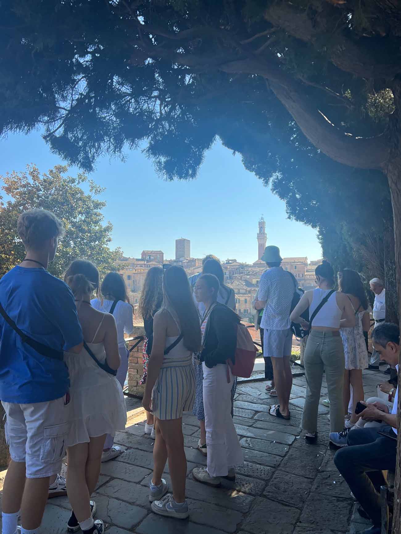 Der nächste Morgen beginnt mit einem Ständchen, weil eine Freundin aus der Stufe Geburtstag hat. Jeder ist dabei und es ist harmonisch, so etwas mit der ganzen Stufe feiern zu können. Während der Fahrt an unser heutiges Ziel, die Stadt Siena im Osten der Toskana, überlege ich mir, wie man diese Fahrt noch nachhaltiger gestalten kann, da unsere Studienfahrt unter dem Motto „Nachhaltigkeit“ steht. Ideen wie die einer wiederbefüllbaren Trinkflasche haben viele genutzt und mir fallen die gestern gekauften Bio-Äpfel in meiner Tasche ein. Die Aussicht ist heute besonders schön, weil wir ein kleines Dorf an einem Berg mitten in der Landschaft über Serpentinen durchfahren. Ohne Probleme steuert der Konvoi durch die engen Straßen. Angekommen in Siena besichtigen wir die Basilika di San Domenico. Die Stadt Siena ist in 17 verschiedene Bezirke, die sogenannten Contraden, getrennt. Jede Contrade zeichnet sich durch ein eigenes Wappentier, eigene Gemeindehäuser und sogar Taufen aus und die Flaggen schmücken je nach Stadtteil die Straßen. Trainierte Pferde der Contraden treten jedes Halbjahr in einem harten Pferderennen auf dem Piazza del Campo gegeneinander an, auf welchem wir ein Stufenfoto schießen. Zurück im Hotel wird der Geburtstag gefeiert und wir genießen einen malerischen Sonnenuntergang.