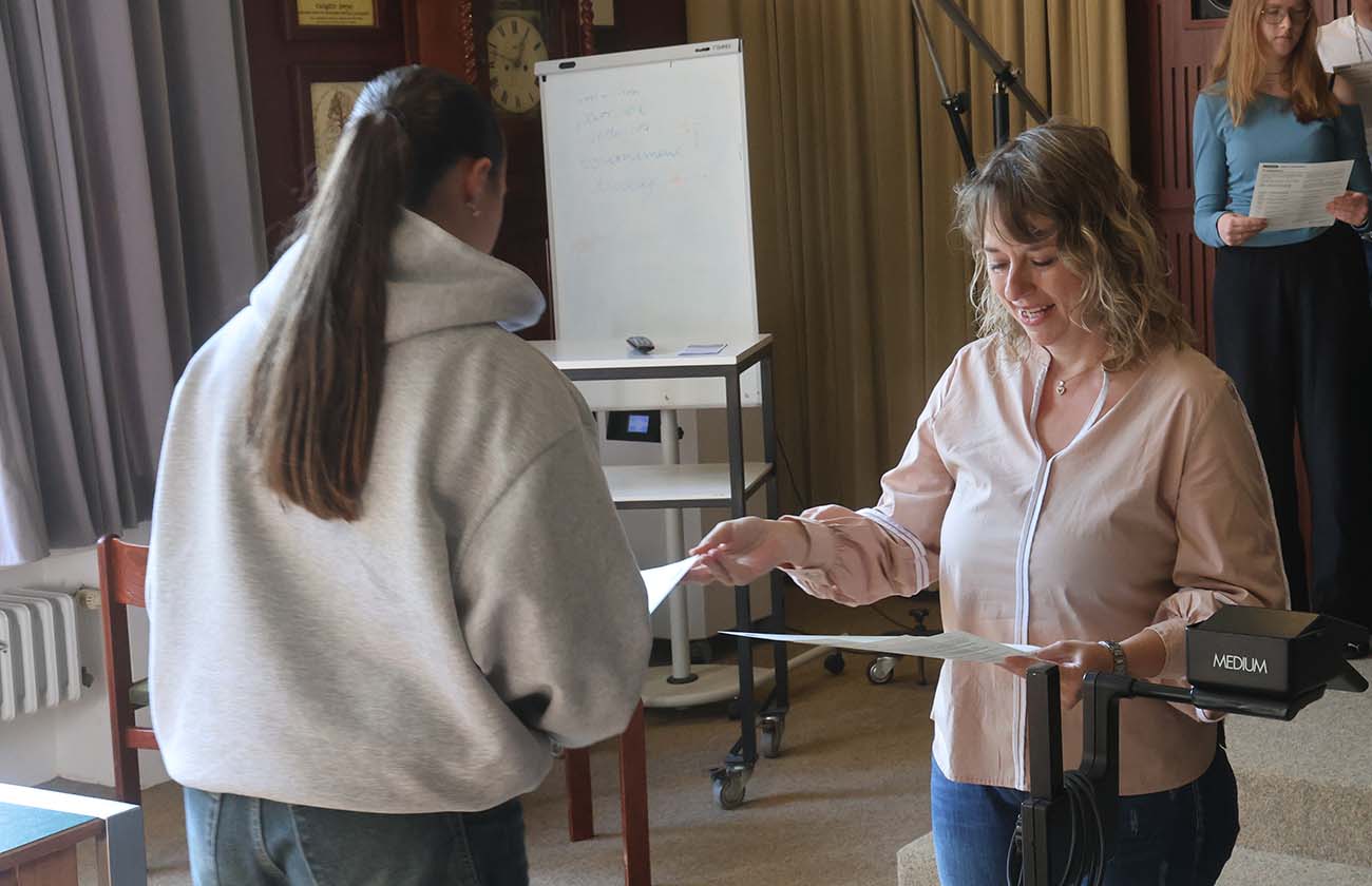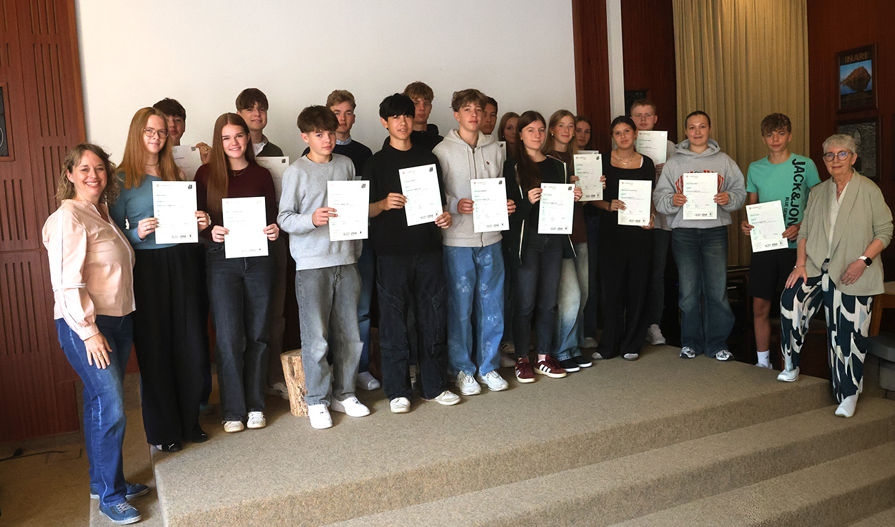 Insgesamt 28 Gaesdonckerinnen und Gaesdoncker der 9. und 10. Klassen können in 2025 ein Cambridge Zertifikat des Levels B1 oder B2 des Gemeinsamen Europäischen Referenzrahmens (GER) ihr Eigen nennen. In den Kompetenzen Reading, Writing, Listening und Speaking zeigten die TeilnehmerInnen eines mehrmonatigen Vorbereitungskurses von Frau Heidemeyer ihr Können in der Zielsprache Englisch. Das Cambridge Zertifikat wird von vielen Arbeitgebern und Universitäten weltweit als Kompetenznachweis anerkannt, worauf auch Schulleiterin Frau Schleede-Schmalz noch einmal hinwies.