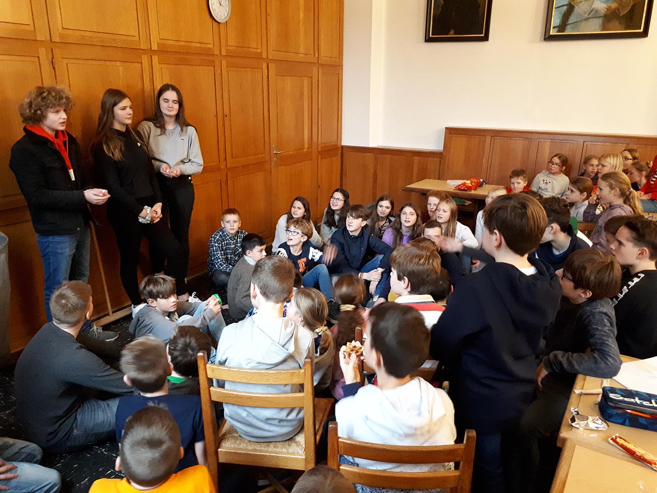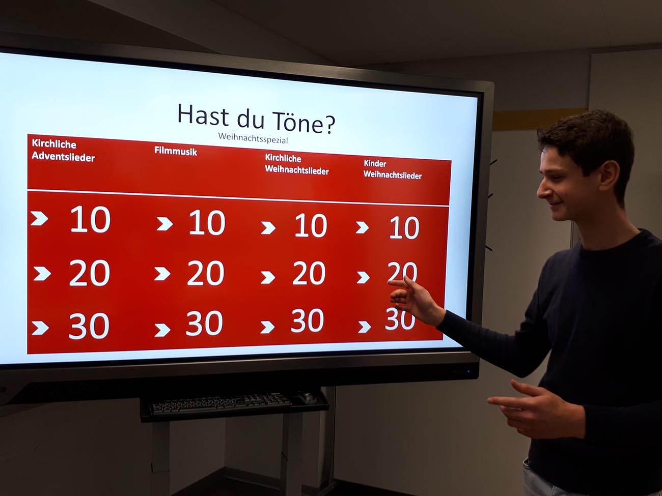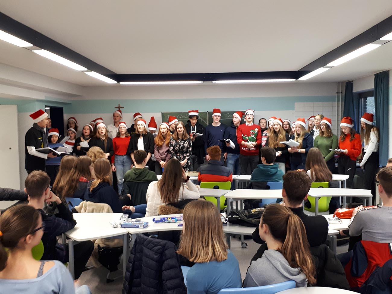 Ideen zur programmatischen Gestaltung lagen dabei ausschließlich in den Händen der Schüler. Ein EF-Kurs hat beispielsweise ein weihnachtliches Liederquiz für die 7c vorbereitet, anderswo wurde ein pantomimisches „Wer bin ich?“ gespielt. Ein weiteres Highlight war der Besuch der Gruppen durch den phantastischen aCAGella – Chor der Schule, welcher stimmgewaltig bekannte Weihnachtslieder vortrug.