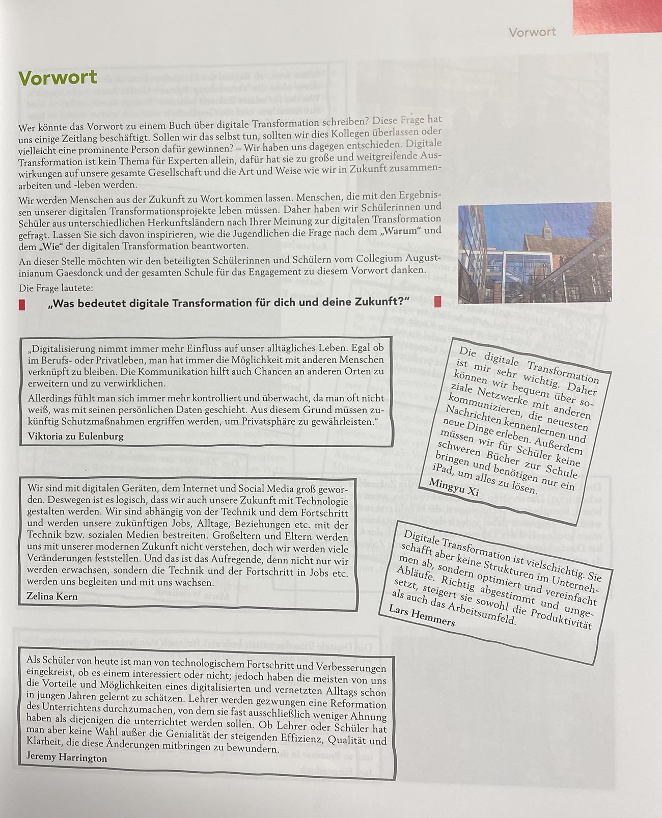 Im Projektkurs Medien (Schuljahr 2020/2021) der diesjährigen Abiturientia, die den Kurs in der Q1 absolvierten, gab es einen Kontakt des Lehrers zum Herausgeber des Buches „Handbuch der Digitalen Transformation“, Benno van Aerssen. Der Innovationscoach und Mitherausgeber dieses Nachschlagwerkes mit 222 Methoden und Instrumenten zur Digitalisierung hatte die Idee Schülerinnen und Schüler in dem Vorwort zu diesem Buch zu Wort kommen zu lassen. Die Herausgeber und der Verlag zeigten sich beeindruckt von den Statements unserer Oberstufenschülerinnen und -schüler zur Zukunft der Digitalisierung und veröffentlichte einige im Vorwort des Buches.